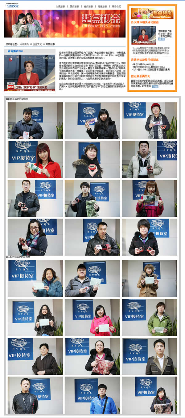 作為東北地區(qū)首家舉辦旅游相關(guān)產(chǎn)品“整點秒殺”活動的旅行社,沈陽青年國際旅行社自3月1日舉辦“秒殺”活動起,便受到廣大網(wǎng)友的大力支持和社會各界的廣泛關(guān)注,甚至于服務(wù)器在某一'整點秒殺'時段由于瀏覽量過大而一度癱瘓。至2011年3月7日止,被上海東方衛(wèi)視、新浪財經(jīng)、東北新聞網(wǎng)、第一時間等諸多知名媒體轉(zhuǎn)載報道,至此沈陽青年國際旅行社向廣大網(wǎng)友和社會各界關(guān)愛沈陽青旅的朋友表示深深的謝意,我們會繼續(xù)努力,為您帶來更多的優(yōu)質(zhì)服務(wù)。