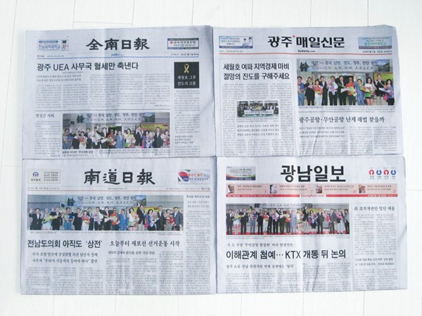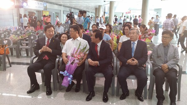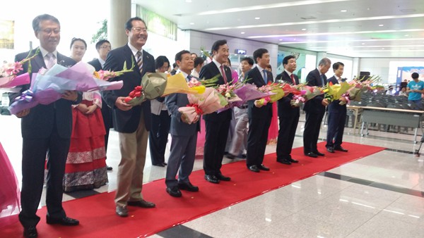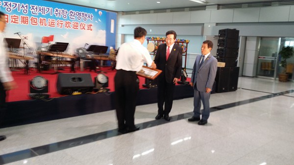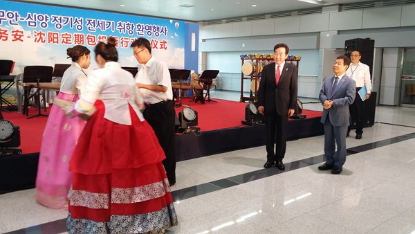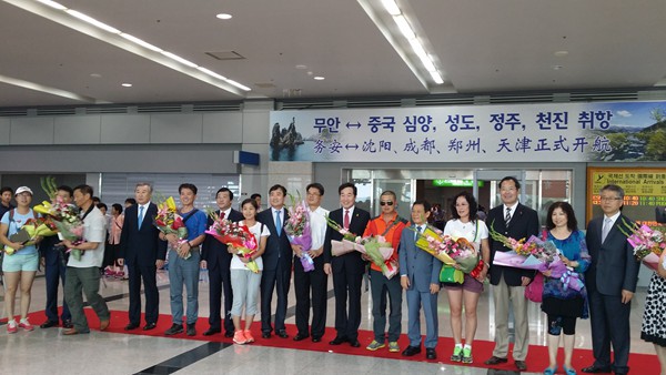 2014年7月16日,沈陽青年國際旅行社韓國包機首發(fā)團在董事長倪琛善的帶領(lǐng)下落地韓國務(wù)安機場,韓方舉辦了盛大而熱烈的啟航歡迎儀式。韓國光州廣域市市長尹荘鉉、中國駐光州總領(lǐng)事王憲民、全羅南道知事李洛淵、全羅南道觀光協(xié)會會長李江宇、務(wù)安郡郡守金澤州等領(lǐng)導(dǎo)對倪琛善董事長及包機首發(fā)團游客進行親切友好的接待。雙方互贈禮物,共同參加了韓方準備的歡迎洽談宴會。