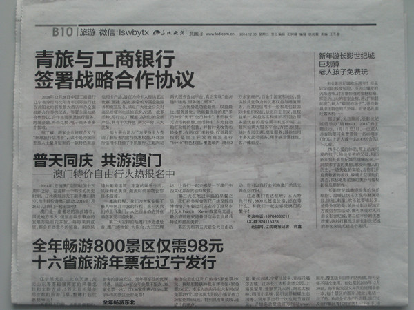 2014年12月26日中國工商銀行遼寧分行與沈陽青年國際旅行社在沈陽北約客維景大酒店舉辦全面戰(zhàn)略合作簽約儀式,簽署全面戰(zhàn)略合作協(xié)議,合作主要涉及旅行服務(wù)、跨境金融、外幣兌換、電子商務(wù)等多個(gè)領(lǐng)域。兩家企業(yè)將聯(lián)合發(fā)行“環(huán)球旅行信用卡”,該卡是為國際差旅人士定制的商旅信用卡!