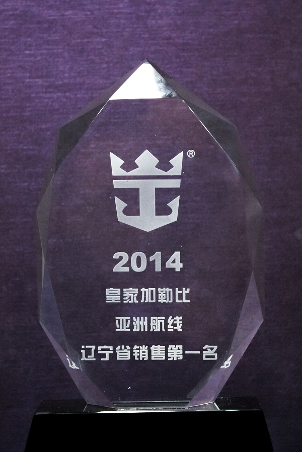 2015年1月14日 皇家加勒比國際游輪2014年度頌獎(jiǎng)晚宴在上海舉行,晚宴上,舉行了“2014年皇家加勒比亞洲航線銷售前十名”頒獎(jiǎng)典禮,我社獲得“皇家加勒比亞洲航線遼寧省銷售第一名”